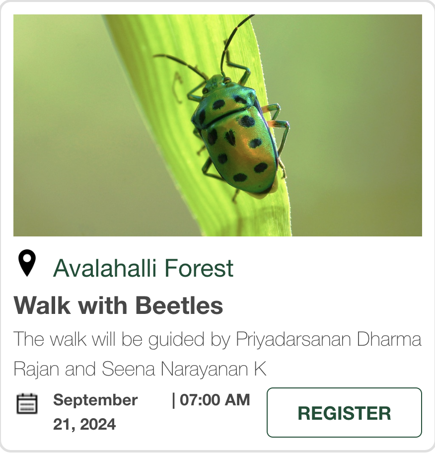 Join this walk at Avalahalli Forest and discover the fascinating world of beetles. The walk will be guided by Priyadarsanan Dharma Rajan and Seena Narayanan K of ATREE