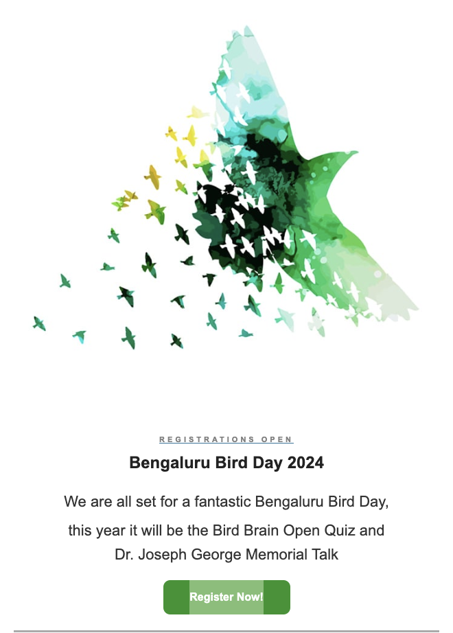 This Bengaluru Bird Day, get ready for Bird Brain Open Quiz  Participate in the most exciting bird quiz that has become a much-awaited annual event. Open to teams of all ages, this one will be a cracker! Dr. Joseph George Memorial Talk : Birdwatching as a Window to the World of Ecology and Conservation By […]